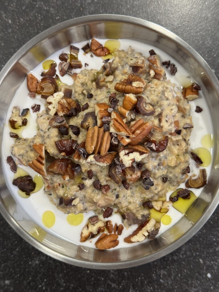 Topping optionnel : dattes mejdool coupées, noix de pécan et cacao cru