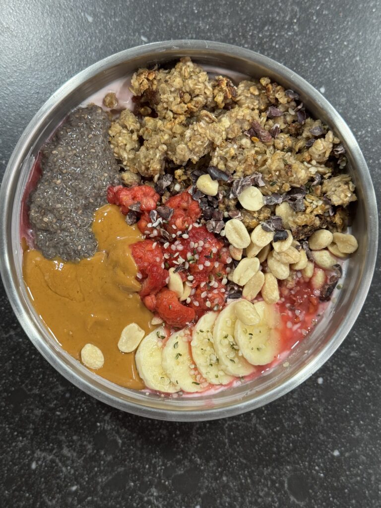 1 càc d’açaï en poudre (puissant antioxydant, soutien cardiovasculaire et immunitaire, confort digestif et full bons nutriments) ;