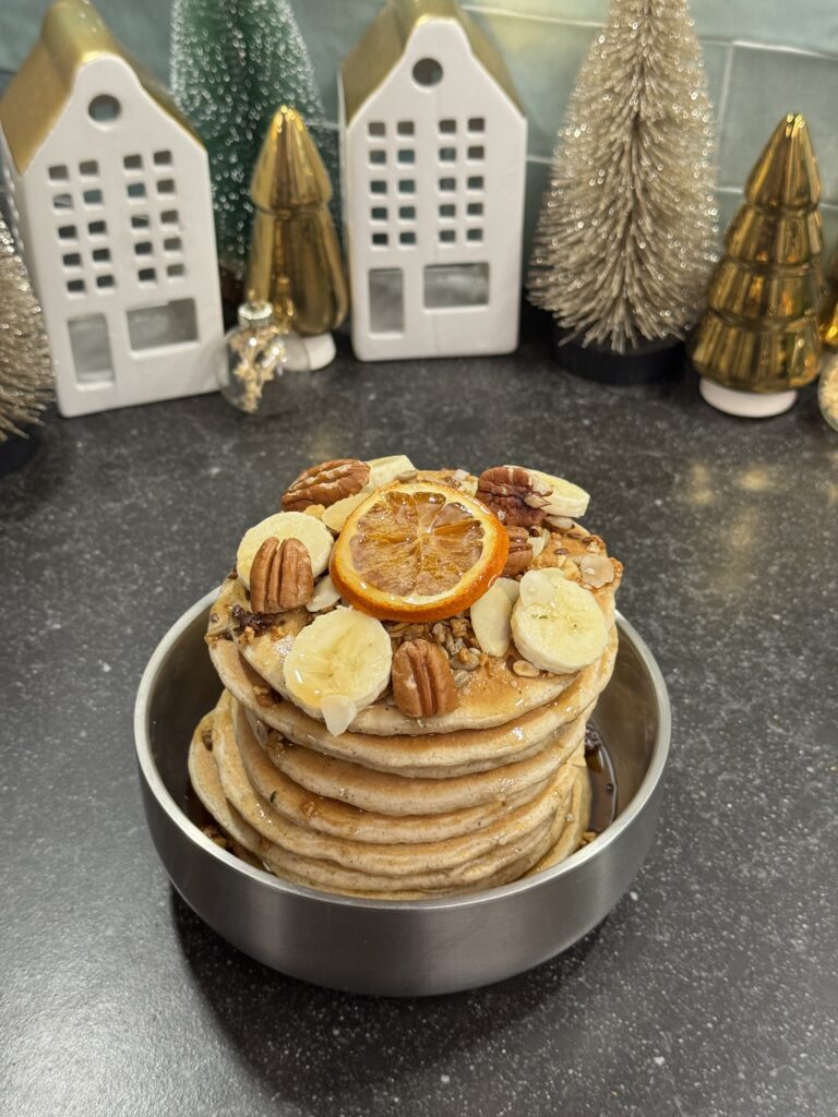 Pancakes au pain d’épices 🥞✨ Des pancakes parfumés aux épices de Noël… Un matin parfait dans un bol de douceur ✨ Ingrédients : • 150 g farine • 1 œuf • 200 ml lait • 1 càs sirop d’érable • 1 c. café levure • 1 c. café épices pain d’épices • 1 pincée de sel Préparation : 1️⃣ Mélange farine + levure + épices + sel. 2️⃣ Ajoute œuf + lait + sirop d’érable → mixe. 3️⃣ Laisse reposer 5 minutes. 4️⃣ Cuis à feu moyen 1–2 min par face. 5️⃣ Ajoute du topping : sirop d’érable, granola, banane, noix… selon ton mood 🍊