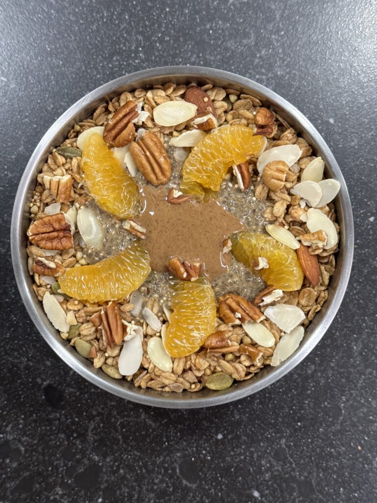 Le lendemain matin, dépose ton topping préféré : perso j’ai déposé du granola @lafavo, des amandes effilées, des quartiers de clémentine, des noix de pécan et du beurre d’amande. Enjoyyyyy 💛